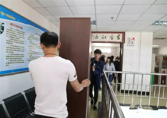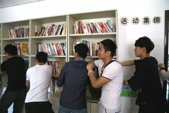 该社区二楼的社区书屋内原本格局混乱,书籍分类错杂,参差不齐。随后,在工作人员的安排下,体格健硕的男生们将书屋内的书柜一个个推搬整齐,方便同学们整理图书。