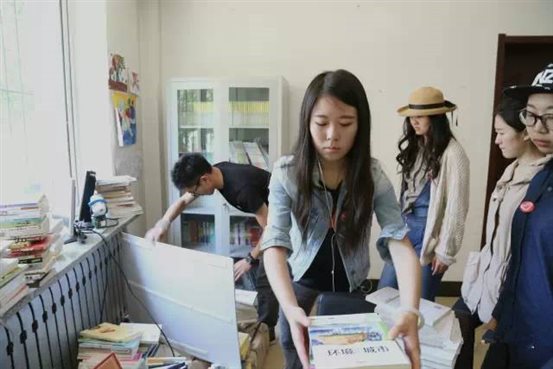 同学们齐心协力,将所有的图书汇集在一起按照书籍类别重新整理分类,同学们分工明确竭尽自己所能认真整理着每一本图书。