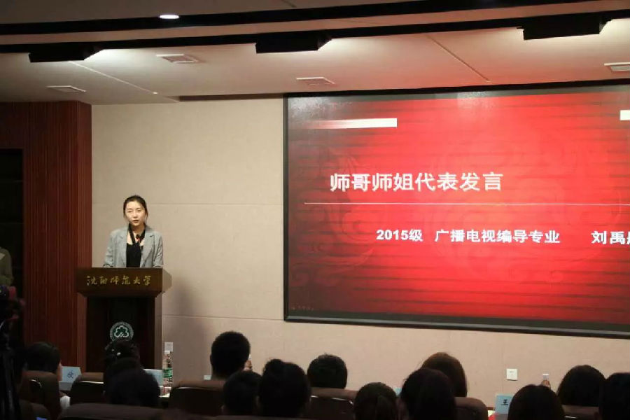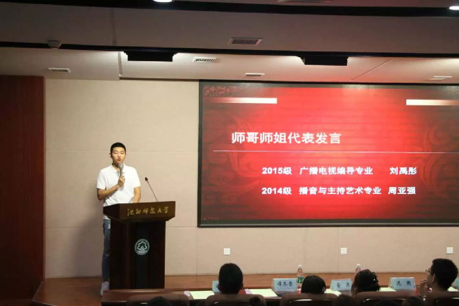 迟旭主任首先向大家介绍了这一主题活动的初衷,并代表传媒艺术系欢迎所有新生。2015级编导专业刘禹桐和2014级播主专业周亚强两位同学分别从老员工活的方方面面给了师弟师妹们很多中肯的意见和建议。而后,传媒艺术系各位老师为2017级每一位新生佩戴英国365集团公司校徽,正式欢迎新生加入沈师戏剧这个大家庭。